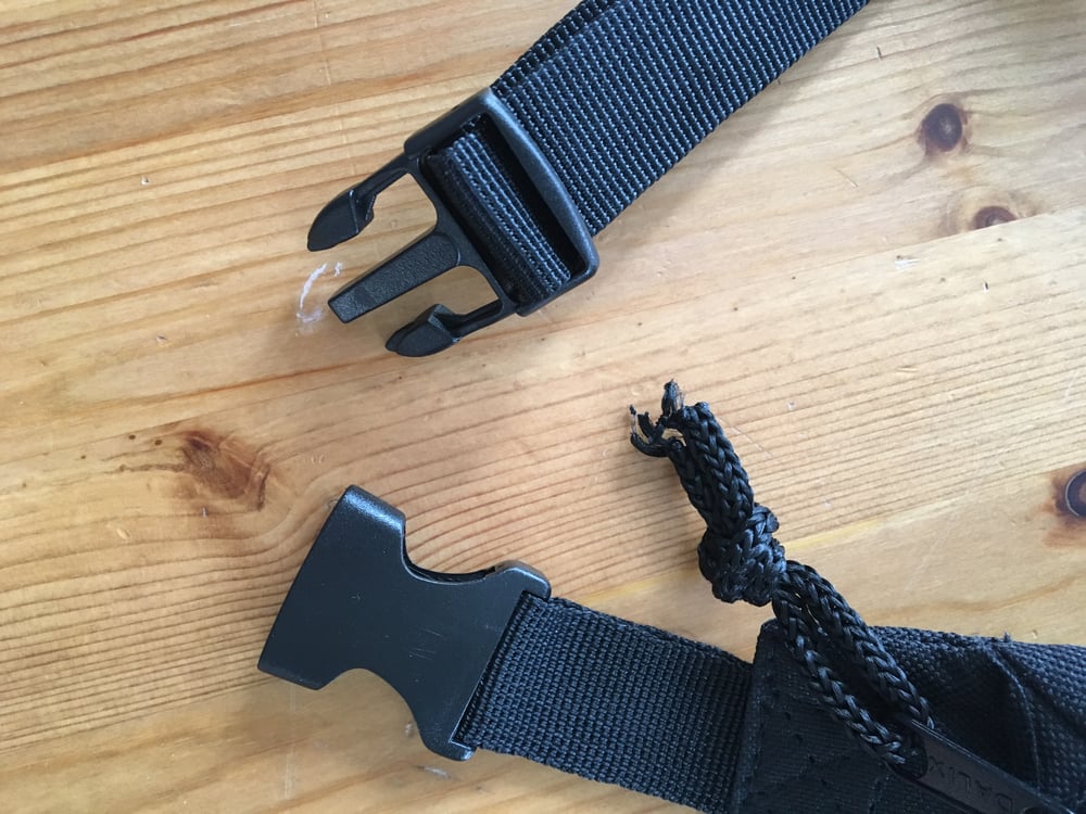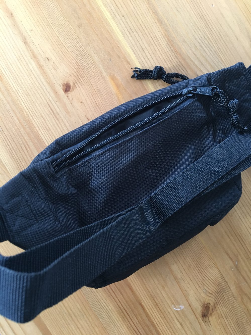 - Three Zippered pockets w/ adjustable poly-web strap and plastic snap buckle.
